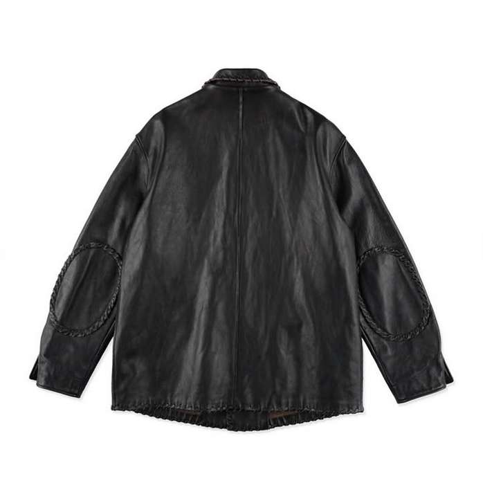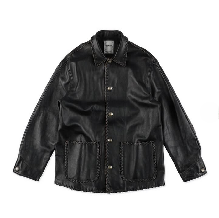 革端に平テープ状のレザーを巻いたカバーオール型が放つ、どこかオールドな佇まい。1900年代初頭の米セントコインを叩き出して仕立てたコンチョボタンがアクセントとなり、肘当て・ポケット・革端のレザーテープ(革紐)ワークが冴えるシンプルなジャケット。芯色を別色に設計した牛革は表面をブラックで仕上げ、着込むほどに擦れから芯色がのぞく——アメリカン・ヴィンテージ好きの心を射抜く一着。