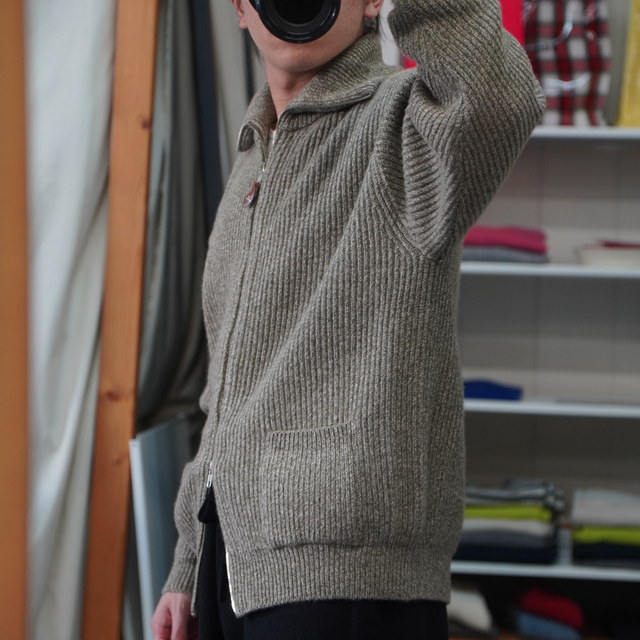 本当はドライバーズニットに関しては、ポケット無しが基本的な使用になります。元々、トラックドライバーや作業員向けに作られた防寒性・機能性重視のニット。元々はジャケットや作業着の下に着る中間着として設計されており、外ポケットの必要がなかった。