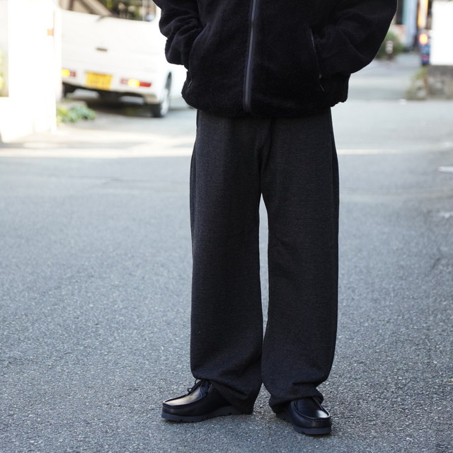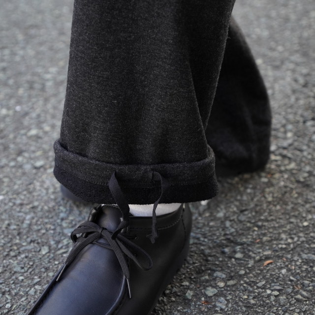 Inspired by vintage track pants, these pants have a gusset under the crotch, and unlike vintage pants with their flat, easy-to-wear patterns, they are designed with the body’s movement and volume in mind, taking into account the thickness of the sturdy fabric. Both the face and pile are made from washable worsted wool, with a tightly knit 100% wool fleece lining. Taking advantage of the benefits of woolen top dyeing, the front and back are finished in different shades of brownish gray, creating a nuanced color. Care is also taken into consideration, with the pants being finished with a product wash, and the tightly knit stitch results in durability with almost no dimensional change. The waist rib and crotch gusset are made from a weft-knit rib made from the same yarn, making them easy to move in, warm, and excellent for outerwear. The hem has a drawstring, so you can enjoy adjusting the silhouette to your liking.