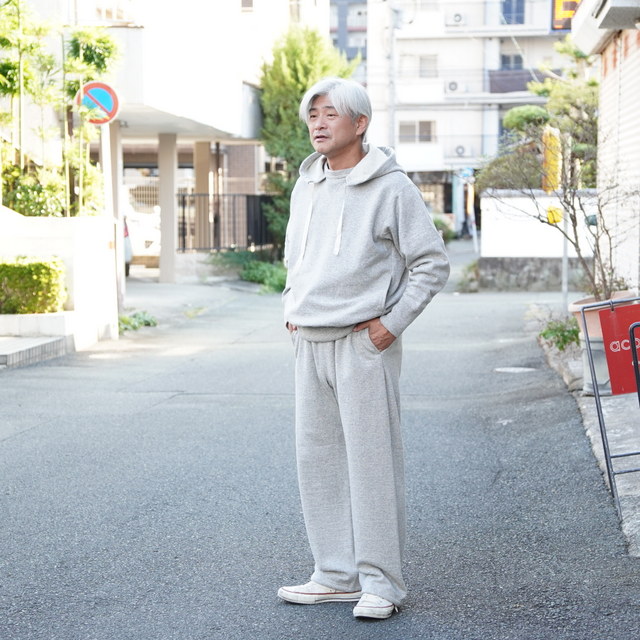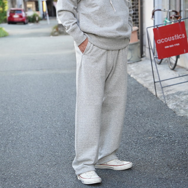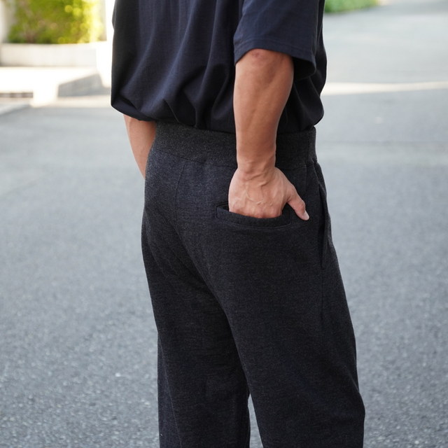 ヴィンテージトラックパンツのイメージで股下にマチを入れ、フラットでイージーなパターンのヴィンテージパンツとは違い、しっかりした生地の肉感を考慮して体の動きと分量を考えた設計で仕上げています。表面もパイル面もウォッシャブルの紡毛ウール素材で、がちっと度目を詰めて編んだウール100%の裏毛素材を使用し、紡毛のトップ染めの良さを生かして、表裏を茶色気味のグレーなトーン違いの色で製作しニュアンスのあるカラーに仕上げています。ケアも考えて製品洗い加工を入れて仕上げており、度詰めで目が詰まっているので寸法変化はほとんどないという頑丈さが特徴です。ウエストリブ・股下部分のマチには共糸で編みたてた横編リブを使用しているため、動きやすく、暖かく、外着としてサマになる優れものです。裾にはドローストリングが付いているため、好みに合わせてシルエットのアレンジが楽しめます。