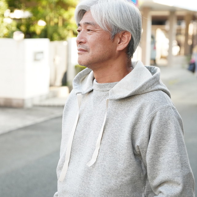 ウールフレンチテリーを使用したフード後付けパーカ。表面、裏面にはウール100%の裏毛素材、表と裏を繋ぐ中糸にもウールを使用したウール100%スウェット、太番手の紡毛ウールを限界に目を詰めたブランドオリジナルの裏毛素材ヴィンテージの後付けフーディをモデルにしたデザインフードにスピンドルコード、ウエストポケットあり