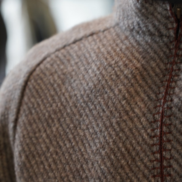 テキスタイル・・・ラグジュアリーブランドが車載用に作るようなブランケットを綾柄で表現いたしました。最高級ウールと、ベビーアルパカ糸をミックスで編み上げたそのタッチはずっと頬擦りしたくなるような肌触りです。